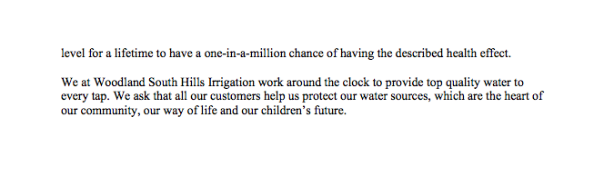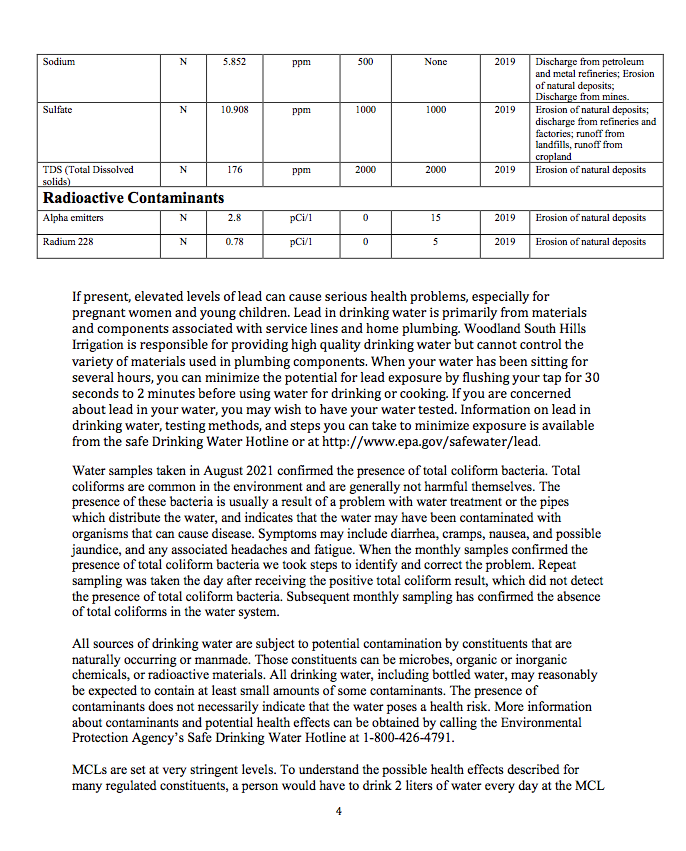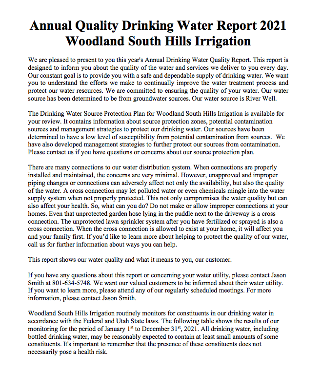 Enclosed is a copy of the Woodland South Hills Irrigation Consumer Confidence Report. It contains the water quality information for our water system for the calendar year 2020 or the most recent sample data.