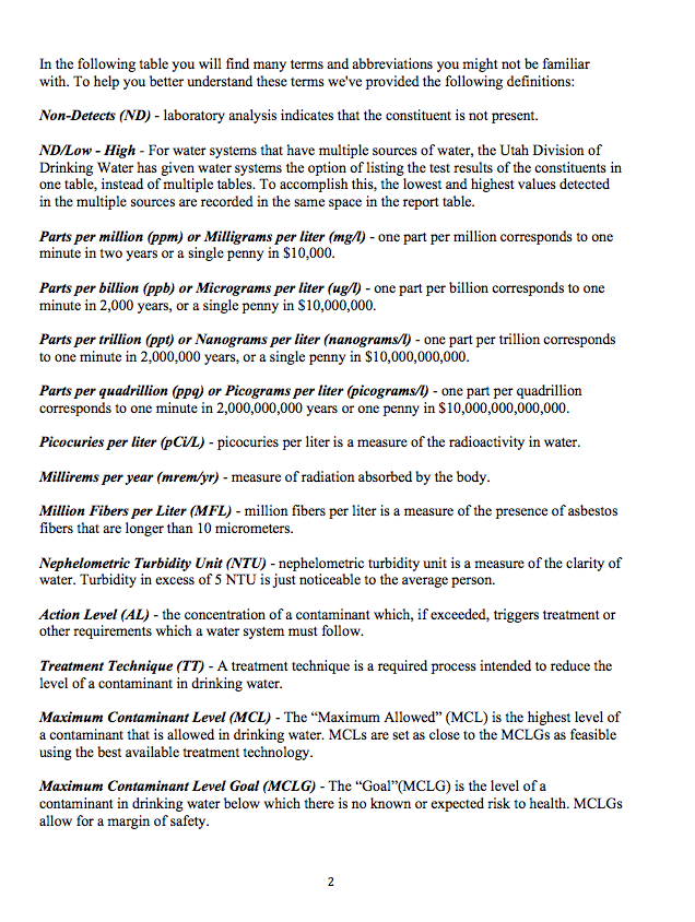 ND/Low - High - For water systems that have multiple sources of water, the Utah Division of Drinking Water has given water systems the option of listing the test results of the constituents in one table, instead of multiple tables. To accomplish this, the lowest and highest values detected in the multiple sources are recorded in the same space in the report table.