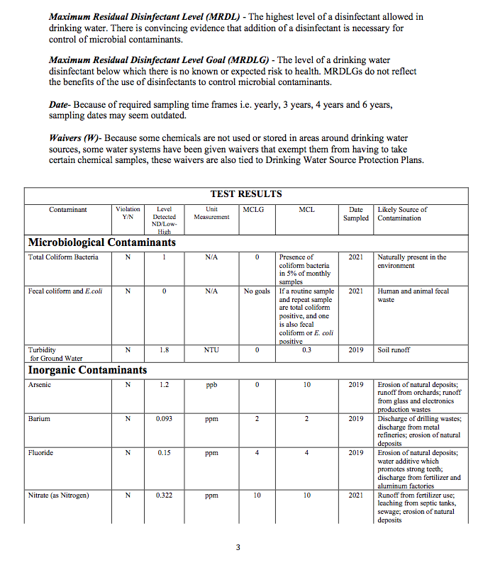 In October of 2018, a test for total coliform tested positive. We believe that this was a result of fire fighting and the use of hydrants. The water system was treated and chlorinated to eliminate those contaminates. Future tests showed that it was testing negative.